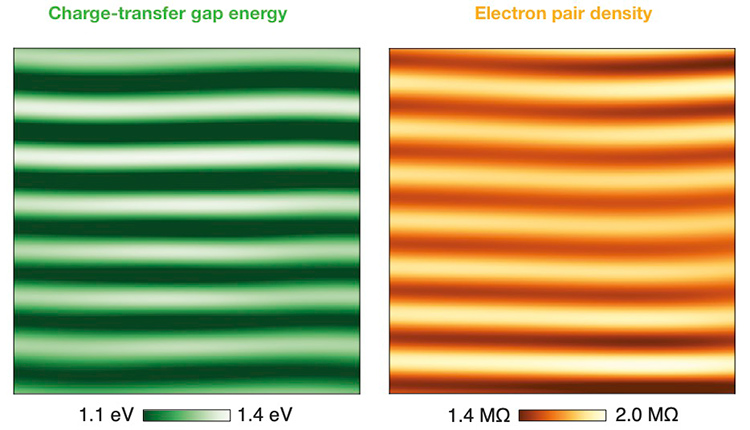 The relationship between the charge-transfer gap (left) and density of Cooper pairs (right), visualized in the wavy undulations of BSCCO layers. Where the CTG is largest (light), the density of Cooper pairs is lowest (dark); where the CTG is smallest (dark), the density of Cooper pairs is highest (light). Adjoined, the two measurements depict a visible link that suggests CTG-mediated superexchange as the mechanism for electron pairing. Credit: Wangping Ren & Shane O’Mahony